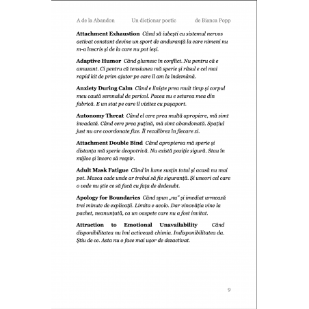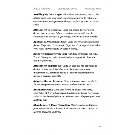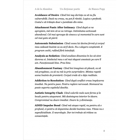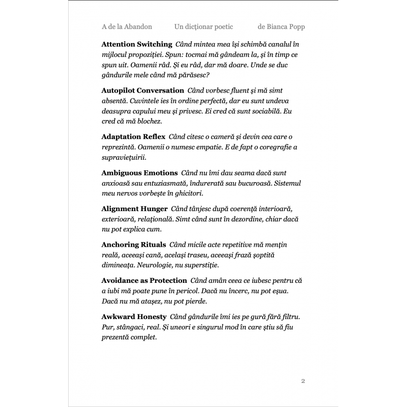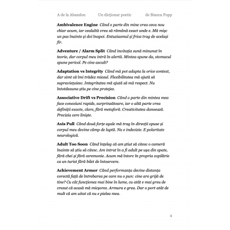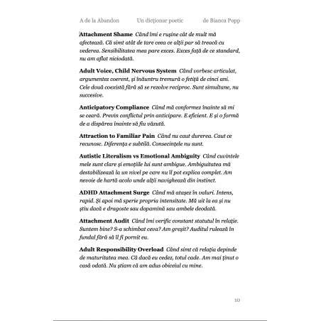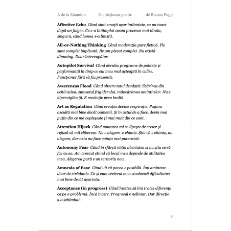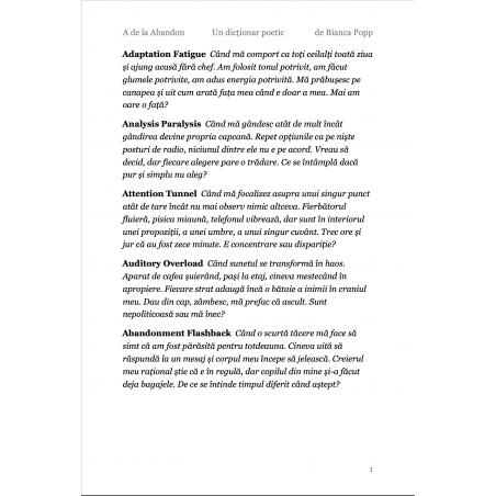A de la Abandon este prima literă dintr-un dicționar care nu a existat până acum. Un dicționar despre creierul neurodivergent, scris în română, gândit în toate limbile în care te-ai simțit altfel. Nu e un dicționar pe care l-ai fi găsit la școală. E cel pe care ai fi avut nevoie să-l găsești.Dar nu e niciodată prea târziu. Eu l-am scris la 50 de ani, ca să mă înțeleg mai bine. și, scriindu-l, m-am descoperit în multe feluri noi, care nu fuseseră nicodată numite. Etichetele ajută uneori. 26 de litere. 2.048 de definiții. O viață de gândit altfel. Primești un PDF cu toate definițiile care încep cu A despre abandon, despre ADHD, despre autism, despre tot ce începe înainte să știi că începe ceva. Poți colecta toate literele. Sau poți rămâne cu A. Uneori e de ajuns.