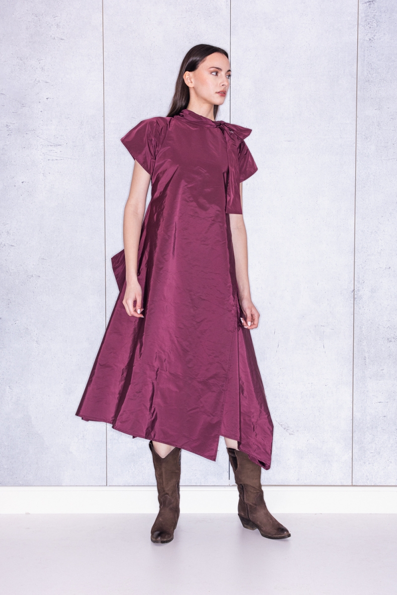 Halves Dress with Shoulder Ribbon in Wine Taffeta