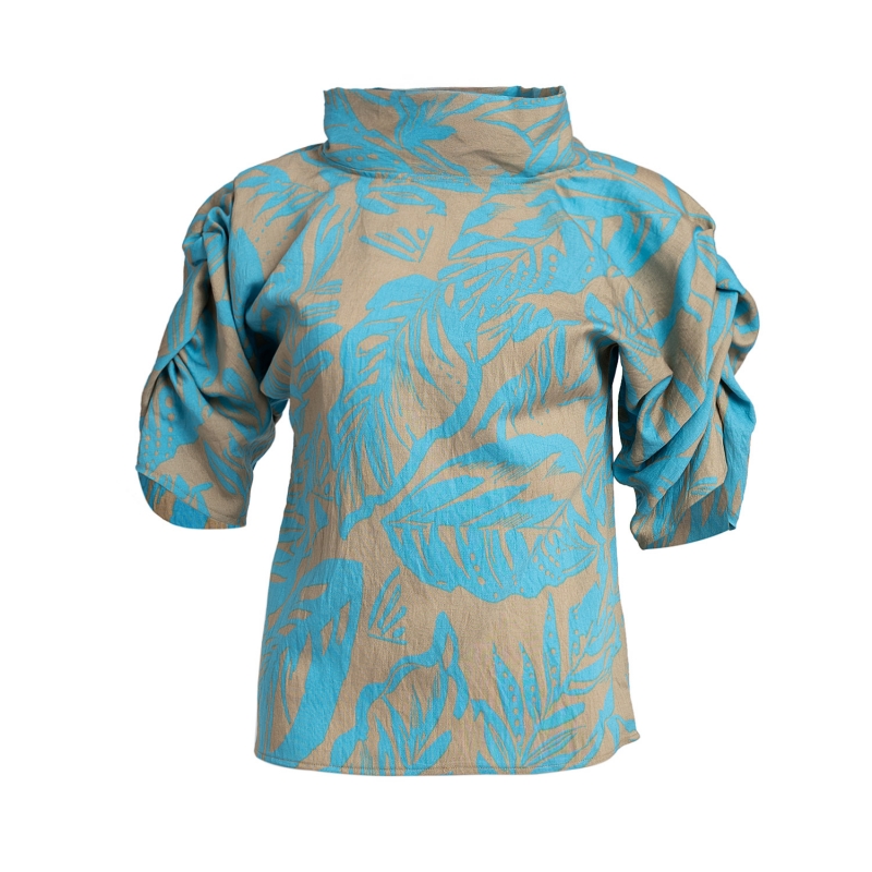 Puff Blouse with Collar in Aqua and Sand