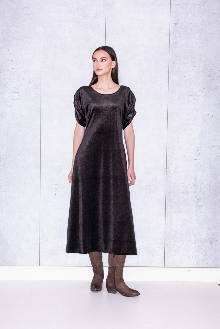 Shoulder Joy Dress in Black Velvet with Golden Shine